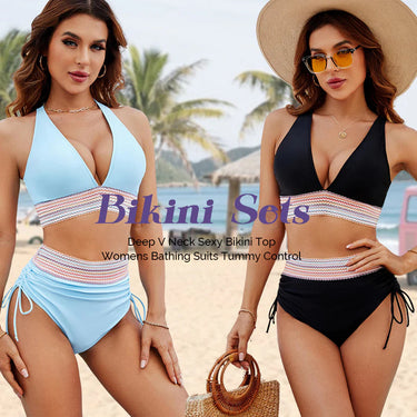Emoswim - High Waisted Tummy Control Color Block Bikini Sets - Black